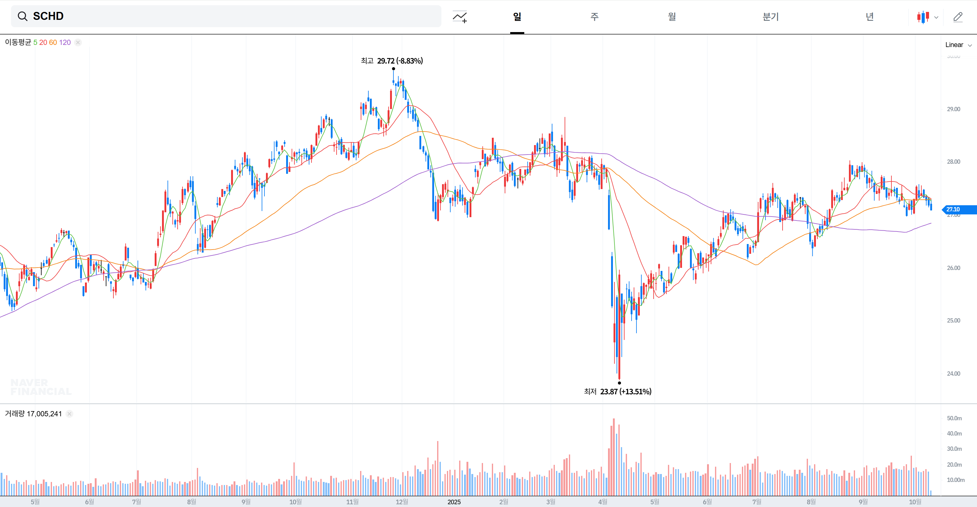 2025년 10월 9일 기준 SCHD ETF의 가격은 27.10달러입니다.