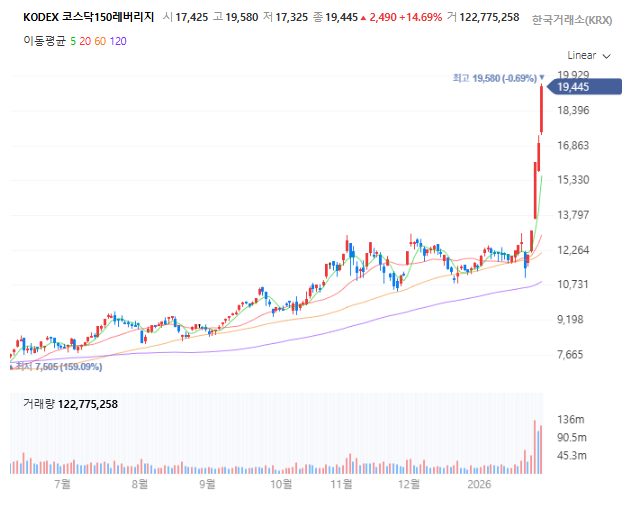 코스닥150의 일간 변동률을 2배로 추종하기 때문에, 지수가 단기간 급등할 때 폭발적인 수익률을 기대할 수 있습니다.